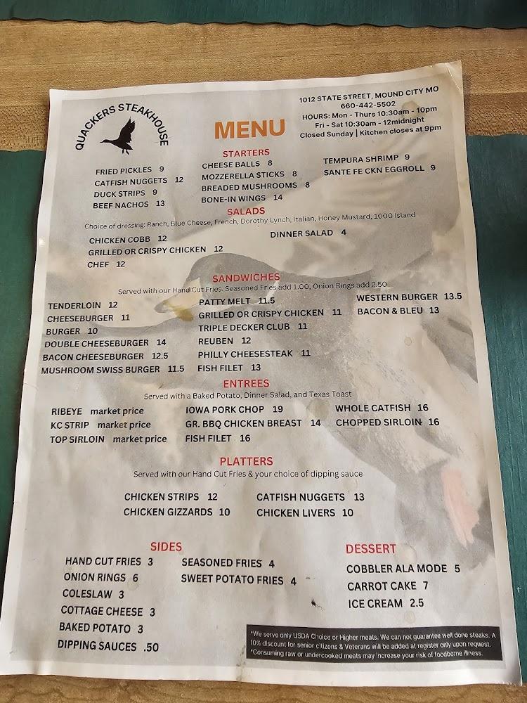 Welcome to Quackers Steakhouse, Mound City’s premier destination for delicious food and a lively atmosphere! Located conveniently off I29, we serve an array of mouthwatering dishes, including high-quality steaks, juicy burgers, hand-breaded tenderloins, and fresh salads. Our full bar features excellent cocktails and a wide selection of beers, making it a perfect spot for happy hour or a family outing. Enjoy dine-in, takeout, or delivery options—all in an accessible environment. Join us for lunch or dinner and experience why Quackers Steakhouse is the go-to choice for great food and fun in Missouri!
