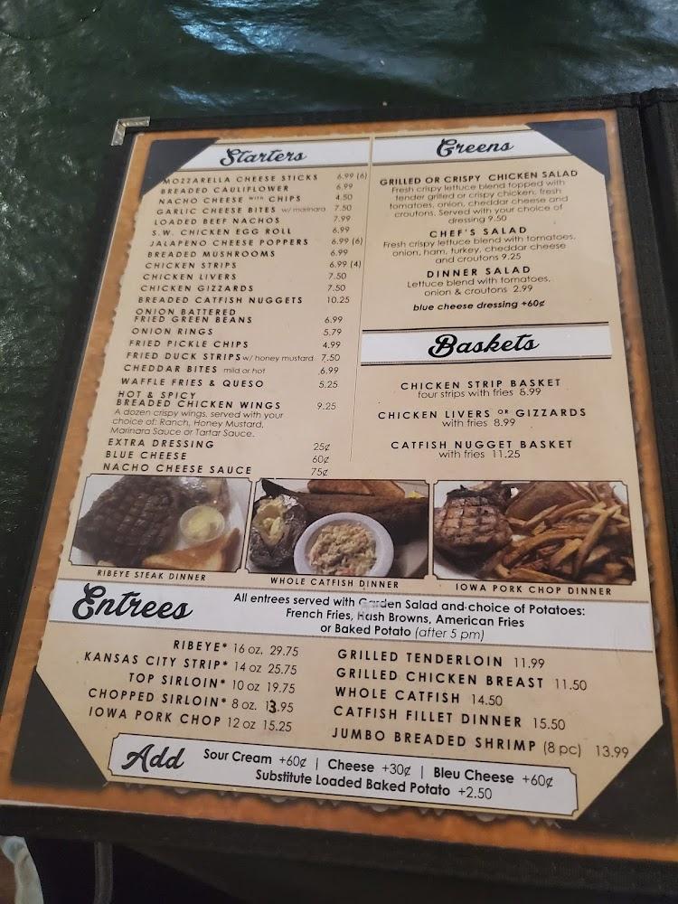 Entrees feature juicy steaks and classic dishes like the Iowa Pork Chop and BBQ Chicken Breast. Don’t forget about the delicious sides like Hand-Cut Fries and Sweet Potato Fries. Desserts such as Cobbler Ala Mode and Carrot Cake finish meals perfectly. Overall, diners will find plenty to love on the menu!